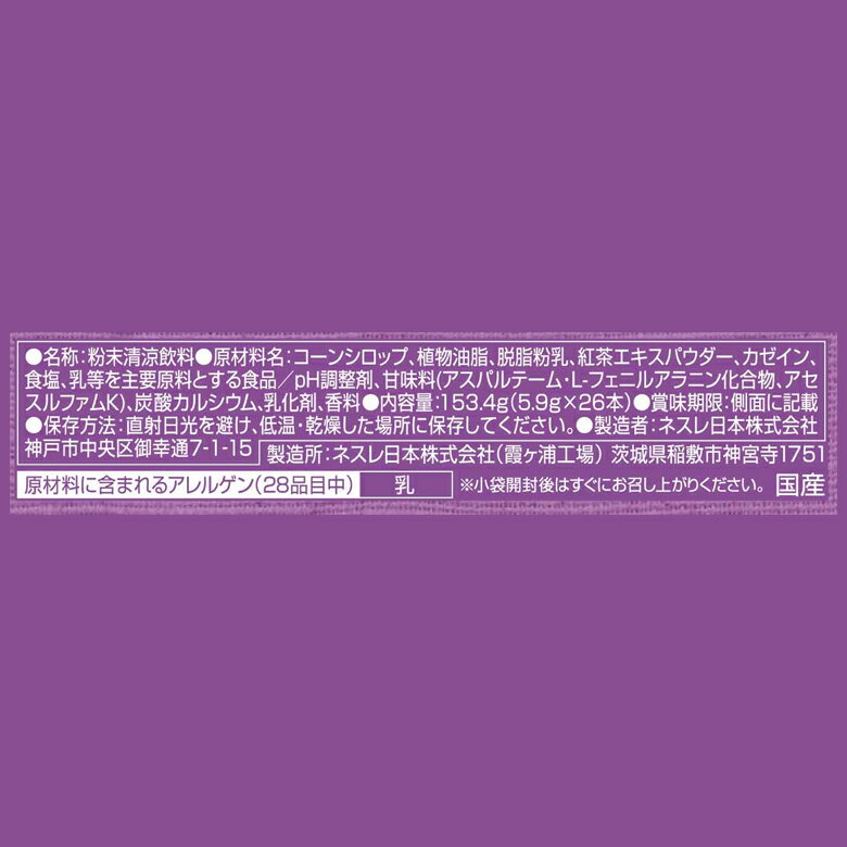【アレルゲン情報】:原材料に含まれるアレルゲン(28品目中):乳 【原材料名】:コーンシロップ、植物油脂、脱脂粉乳、紅茶エキスパウダー、カゼイン、食塩、乳等を主要原料とする食品/pH調整剤、甘味料(アスパルテーム・L-フェニルアラニン化合物、アセスルファムK)、炭酸カルシウム、乳化剤、香料 【製造者】:ネスレ日本株式会社神戸市中央区御幸通7-1-15